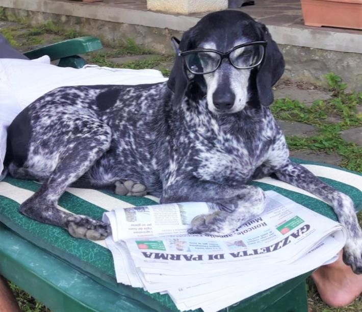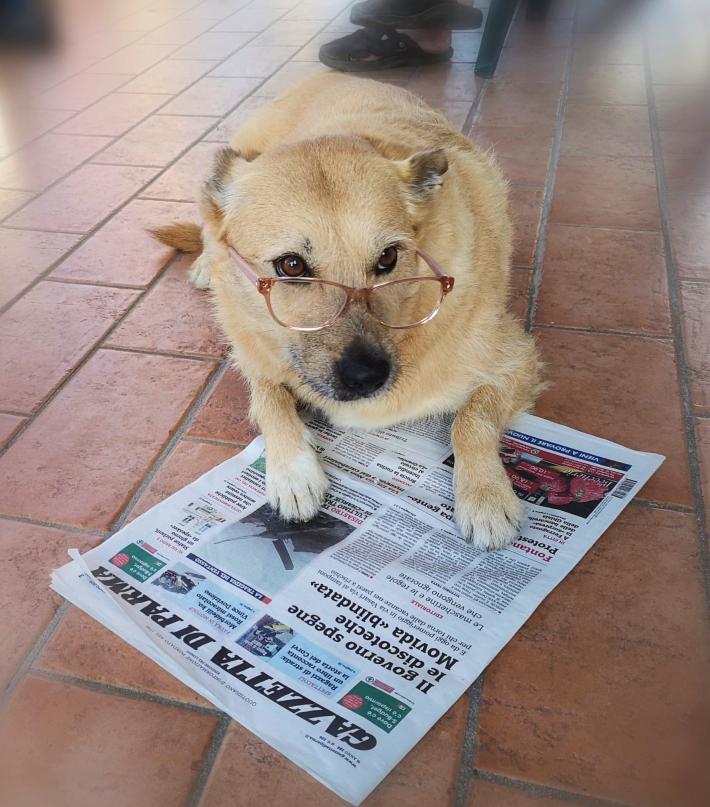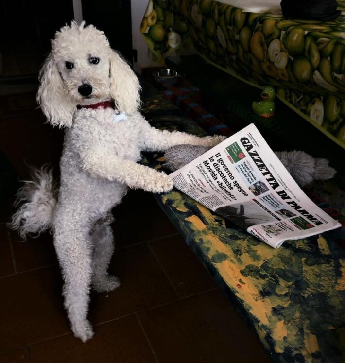 Mosè separò le acque e mise la zampetta sulla prima pagina della Gazza come a dire: questa è mia e me la leggo io. La sua umana Barbara dovrà pazientemente aspettare il suo turno.