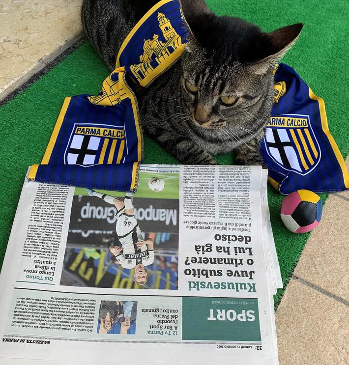 Ecco Paco, un gagliardo tifoso del Parma mentre fa la guardia alla pagina dello sport. La passione per il calcio la condivide col suo umano Riccardo Retini ma la sciarpa del Parma se la tiene tutta per sé...