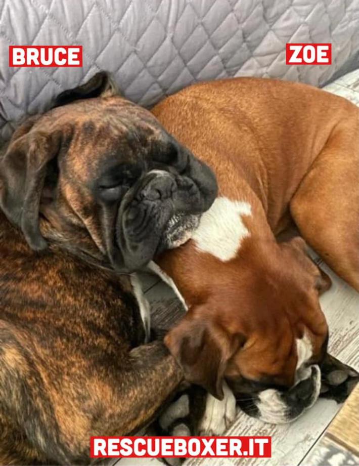 Stupendi Boxer di 2 anni: Bruce, maschio, e Zoe, femmina sterilizzata. Educati e amorevoli con adulti e bambini, adorano le coccole. Inseparabili, per loro si cerca un’adozione di coppia.