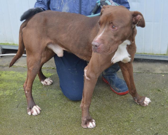 Bel Pit Bull di 9 anni. Buono ed educato con gli umani, non va d’accordo con i cani maschi: adozione come «figlio unico».