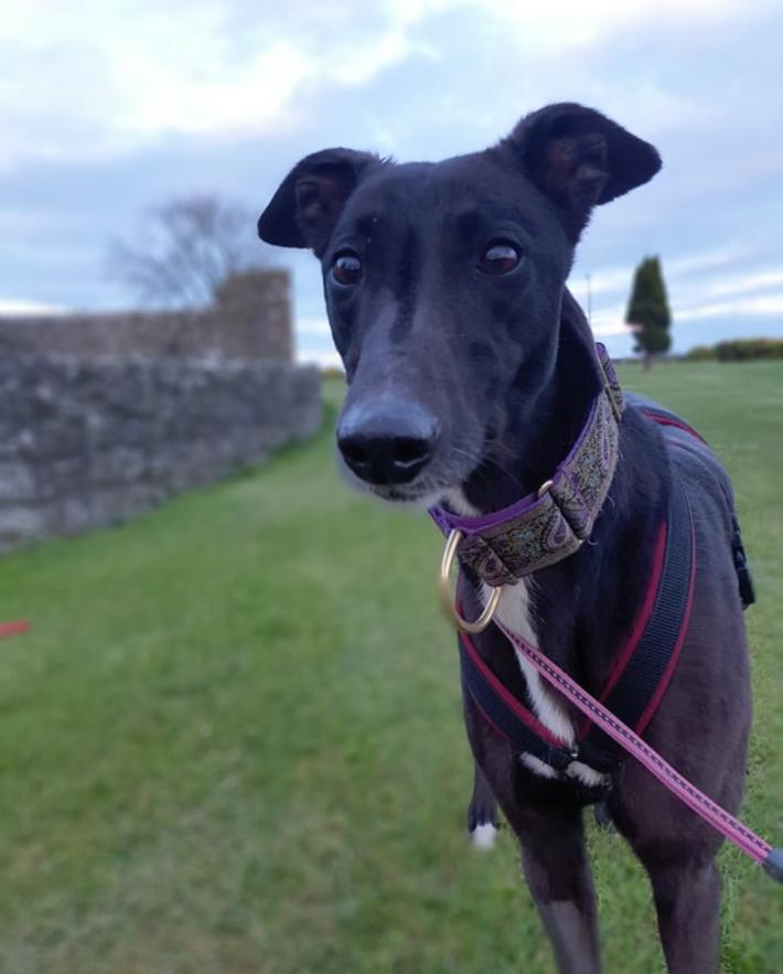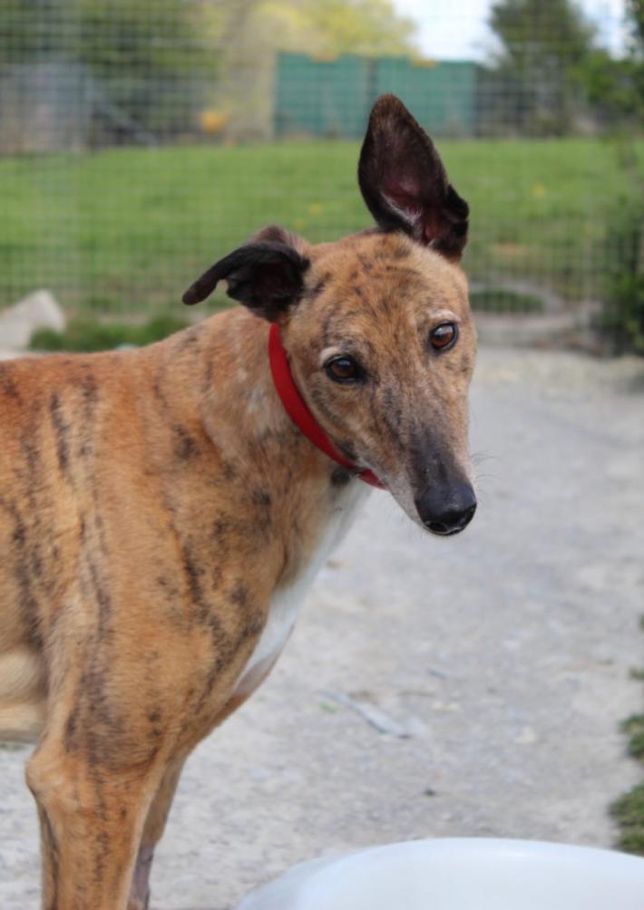 Galgo femmina di circa 2 anni. Curiosa e briosa, a suo con gli esseri umani e i suoi simili. Non compatibile con i gatti. In Italia il 5 giugno.