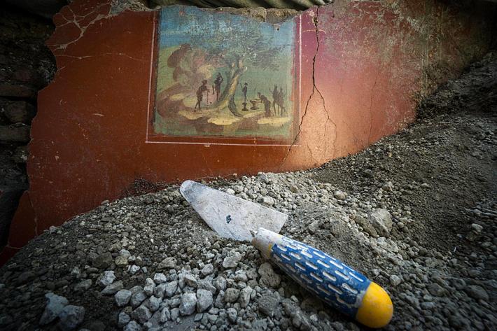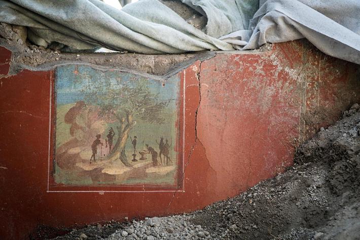 Ma quella della casa Vintage, illustra l’archeologo, non è stata l’unica scoperta delle ultime settimane di scavo. In un ambiente vicino, i lavori hanno restituito i resti di una stanza dove sono evidenti su una parete affrescata i segni di un incendio, certamente dovuto all’eruzione: in un angolo, preziosissimi per gli studi, ci sono i resti carbonizzati di un letto con le stoffe che lo ricoprivano. Non solo: In un’altra delle case del Vicolo dei Balconi, negli ambienti a nord del giardino purtroppo piuttosto devastati dagli scavi settecenteschi, è emersa quella che è stata definita dagli archeologi «la prima scena figurata di una certa complessità». Si tratta, spiega Osanna, «di un quadretto idillico sacrale che raffigura una scena di sacrificio, nelle vicinanze di un santuario agreste». Sul lato opposto della via, infine, è stato individuato anche un ambiente riccamente dipinto con decorazioni in quarto stile, finte architetture e quadretti con pavoni e ciliege. Duemila anni dopo quel terribile 24 agosto del 79 d.C. Pompei non finisce di stupire.