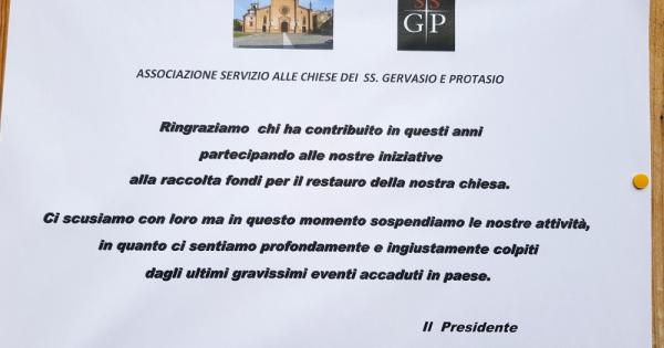 «Ringraziamo chi ha contribuito in questi anni, partecipando alle nostre iniziative, alla raccolta fondi per il restauro della nostra chiesa – ha scritto – ci scusiamo con loro ma in questo momento sospendiamo le nostre attività, in quanto ci sentiamo profondamente e ingiustamente colpiti dagli ultimi gravissimi eventi accaduti in paese».