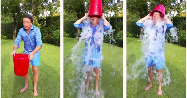 (ANSA) - Il premier Matteo Renzi si versa il secchio d’acqua gelata in testa, segno dell’adesione alla battaglia anti-sla.