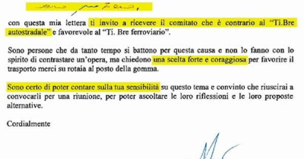 Così come inusuale appare però anche la «sponsorizzazione» del primo cittadino, che intercede per dare una mano ai duri e puri del fronte «no Ti-Bre», definiti «persone che da tanto tempo si battono per questa causa e non lo fanno con lo spirito di contrastare un'opera, ma chiedono una scelta forte e coraggiosa per favorire il trasporto merci su rotaia al posto della gomma». Pizzarotti caldeggia la concessione del tanto atteso appuntamento, rivolgendo parole di apprezzamento a Delrio: «Sono certo di poter contare sulla tua sensibilità su questo tema e convinto che riuscirai a convocarli per una riunione, per poter ascoltare le loro riflessioni e le loro proposte alternative».