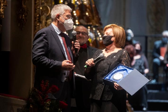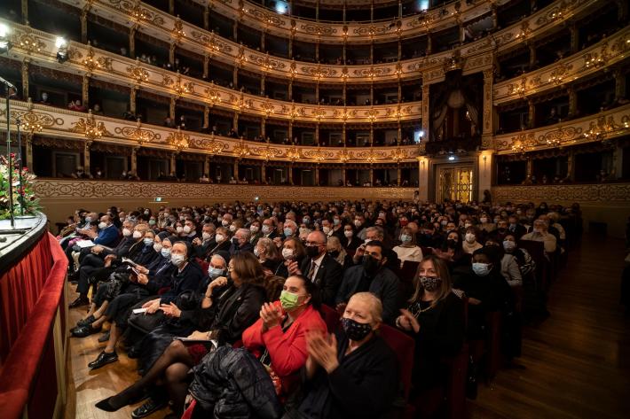 Il coraggio di Enrica Valla, presidente della Corale Verdi e dell’associazione Amici delle Piccole figlie (che ha organizzato l’evento con la collaborazione del Comune di Parma, Lions Club Maria Luigia e Federazione Cure Palliative), si può percepire dai particolari di un mondo della musica che è ancora in ripartenza: «Sono emozionatissima stasera – confida sul palco – vedere il teatro pieno è per noi un grande traguardo. Ho dovuto farmi coraggio, non è semplice organizzare un evento così in questo periodo di pandemia».