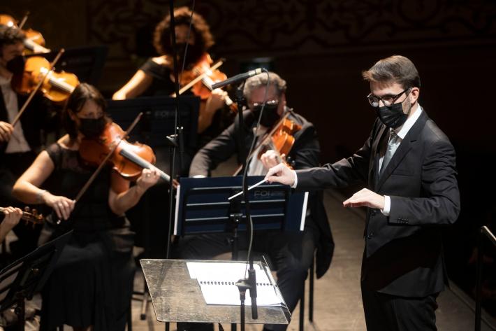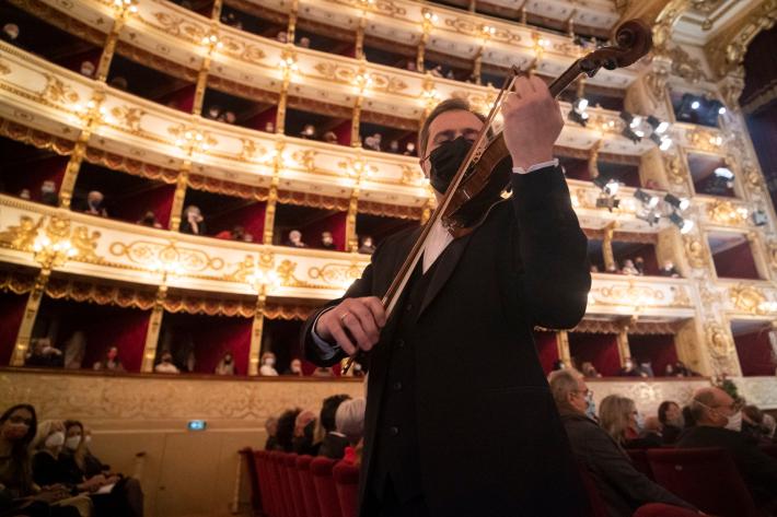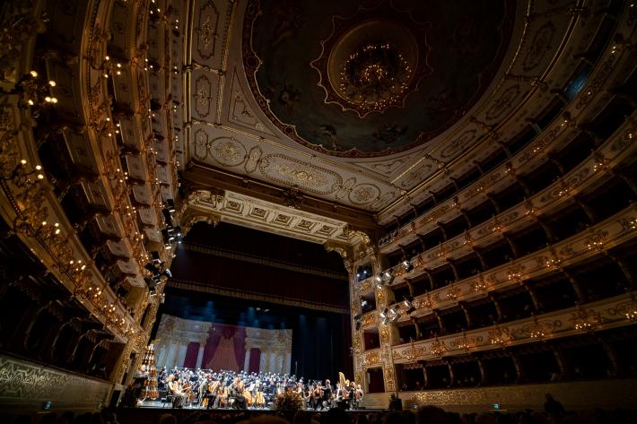 E ancora «Danza Spagnola» di De Falla, «Carmen» di Bizet e «L’ultima canzone» di Tosti. L’acme emotivo è stato raggiunto, però, con l’esibizione del violinista Matteo Fedeli che ha suonato «Oblivion» di Piazzolla con il Violino Guarnieri del 1709. Un’interpretazione struggente che – con una semplicità che lascia completamente disarmati – abbraccia il senso di oblio del brano. Come fosse l’unico depositario di soffio vitale, Fedeli si muove tra le poltrone del Regio solo ma non solo. Lo riempie tutto quello spazio rimasto vuoto per troppo tempo; lo ruba ai secondi e lo restituisce al pubblico come nuovo, arricchito, fecondo. Un incontro d’anime che si sancisce con un passionale «Va Pensiero»: è subito rapimento.