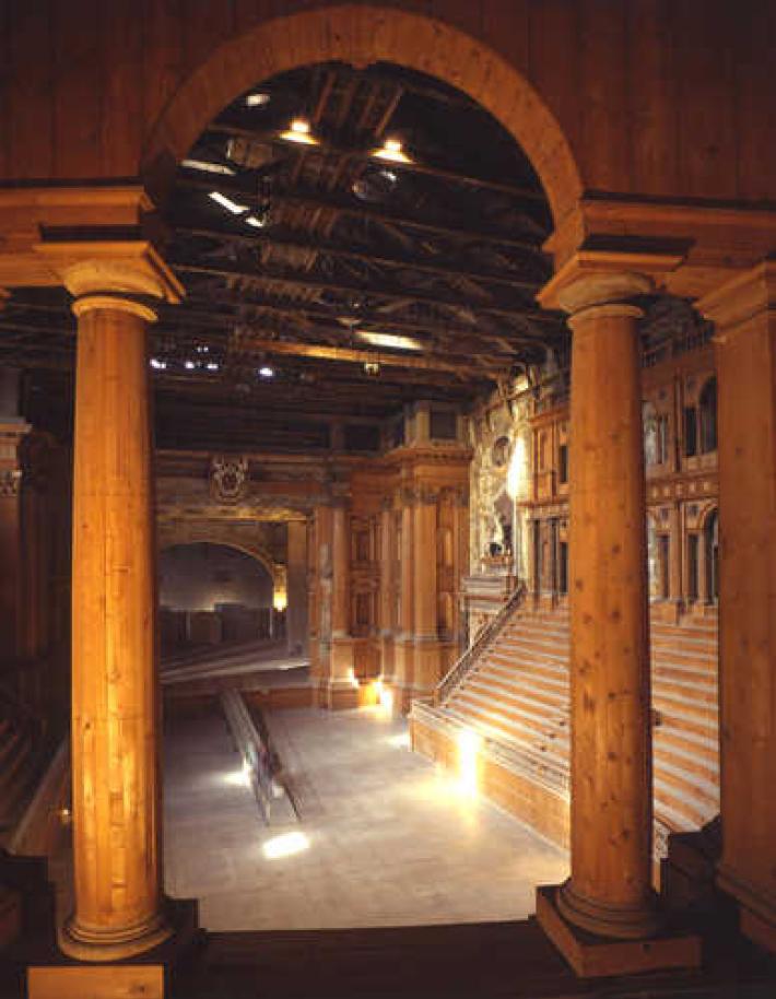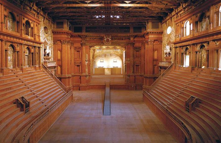 Il Teatro Farnese, a Parma, era il teatro di corte dei duchi di Parma e Piacenza. Oggi è inserito all'interno del percorso della Galleria Nazionale ed è diventato recentemente sede di alcune rappresentazioni concertistiche ed operistiche del Teatro Regio di Parma. Venne fatto costruire a partire dal 1618 da Ranuccio I, duca di Parma e Piacenza, che intendeva celebrare con uno spettacolo teatrale la sosta a Parma del granduca di Toscana, Cosimo II, diretto a Milano per onorare la tomba di san Carlo Borromeo, canonizzato nel 1610. La realizzazione dell'opera venne affidata all'architetto Giovan Battista Aleotti, detto l'Argenta (1546-1636): venne costruito al primo piano del Palazzo della Pilotta di Parma, in un grande vano progettato come Salone Antiquarium ma sempre utilizzato come sala d'armi e come sede di tornei. Il teatro venne completato nell'autunno del 1618 e dedicato a Bellona (dea della guerra, in omaggio alla prima destinazione dell'ambiente) ed alla Muse: a causa di una malattia che aveva colpito Cosimo II, costringendolo ad annullare il pellegrinaggio programmato, il teatro rimase inutilizzato per quasi dieci anni. Venne finalmente inaugurato il 21 dicembre del 1628, in occasione delle nozze di Odoardo, figlio di Ranuccio, con Margherita de' Medici, figlia di Cosimo. Per celebrare l'evento venne allestita lo spettacolo Mercurio e Marte, con testi di Claudio Achillini e musiche di Claudio Monteverdi: nel corso dell'opera venne anche allagata la cavea ed inscenata una naumachia. A causa della complessità e degli elevati costi degli allestimenti, il teatro venne utilizzato solo altre otto volte: l'ultima nel 1732, in occasione dell'arrivo di don Carlo di Borbone nel ducato. L'Argenta si ispirò al Teatro Olimpico di Vicenza, costruito dal Palladio nel 1580, ed al Teatro all'Antica di Sabbioneta, costruito tra il 1588 ed il 1590 dall'architetto Vincenzo Scamozzi. Ospitato in un ampio salone (87 metri di lunghezza per 32 di larghezza e 22 di altezza), la cavea ad U è formata da quattordici gradini sui quali potevano essere ospitati circa 3000 spettatori: alla sommità della cavea sono due ordini di serliane, quello inferiore tuscanico e quello superiore ionico; il palcoscenico è lungo 40 metri, con un'apertura di 12 metri. La struttura venne realizzata in legno (abete rosso del Friuli) ed interamente ricoperto di stucco dipinto per simulare il marmo (materiali caratteristici delle architetture effimere, quale doveva essere il Teatro Farnese). La decorazione scultorea (statue a soggetto mitologico in gesso, con anima di paglia) venne affidata ad una squadra di artisti guidata da Luca Reti; i pittori, guidati da Giovan Battista Trotti detto il Malosso, Lionello Spada, Sisto Badalocchio, Antonio Bertoja e Pier Antonio Bernabei, dovettero provvedere, oltre che alla decorazione delle pareti, anche a quella oggi perduta del soffitto. È da alcuni considerato uno dei primi teatri ad essere dotato di un arco di proscenio permanente, tuttavia quando il teatro fu costruito le rappresentazioni non si tenevano lì. Ingresso del Teatro Farnese all'interno del Palazzo della Pilotta Dopo la rappresentazione del 1732, il teatro decadde inesorabilmente: venne quasi completamente distrutto durante la II Guerra Mondiale, in un bombardamento degli Alleati del 13 maggio 1944. Fu ricostruito tra il 1956 ed il 1960, secondo i disegni originali con il materiale recuperato ed inserito come prestigioso ingresso della Galleria Nazionale di Parma. Solo recentemente, dopo un'inattività durata quasi tre secoli, il teatro è ritornato ad ospitare eventi teatrali con una primissima rappresentazione davanti a 1500 spettatori avvenuta il 12 giugno 2011 del maestro Claudio Abbado e della sua Orchestra Mozart.