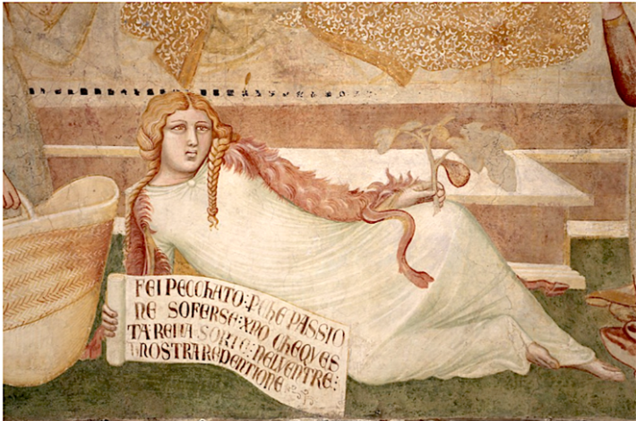 Stranamente, la grande figura di Eva dipinta in primo piano, vestita con un camicione bianco semitrasparente e una pelle di capra sulle spalle – simbolo di lussuria –, sdraiata come fosse a un pic-nic, non fu censurata dal committente cistercense ed è rimasta così come la dipinse Lorenzetti, mentre sventola compiaciuta un ramoscello di fico con tanto di foglie e un frutto maturo. E per quelli che non avessero ancora capito che cosa aveva fatto, mostra un cartiglio in cui confessa: Commisi peccato affinché passione soffrisse Cristo che questa Regina ebbe in sorte di portare nel ventre per nostra redenzione.