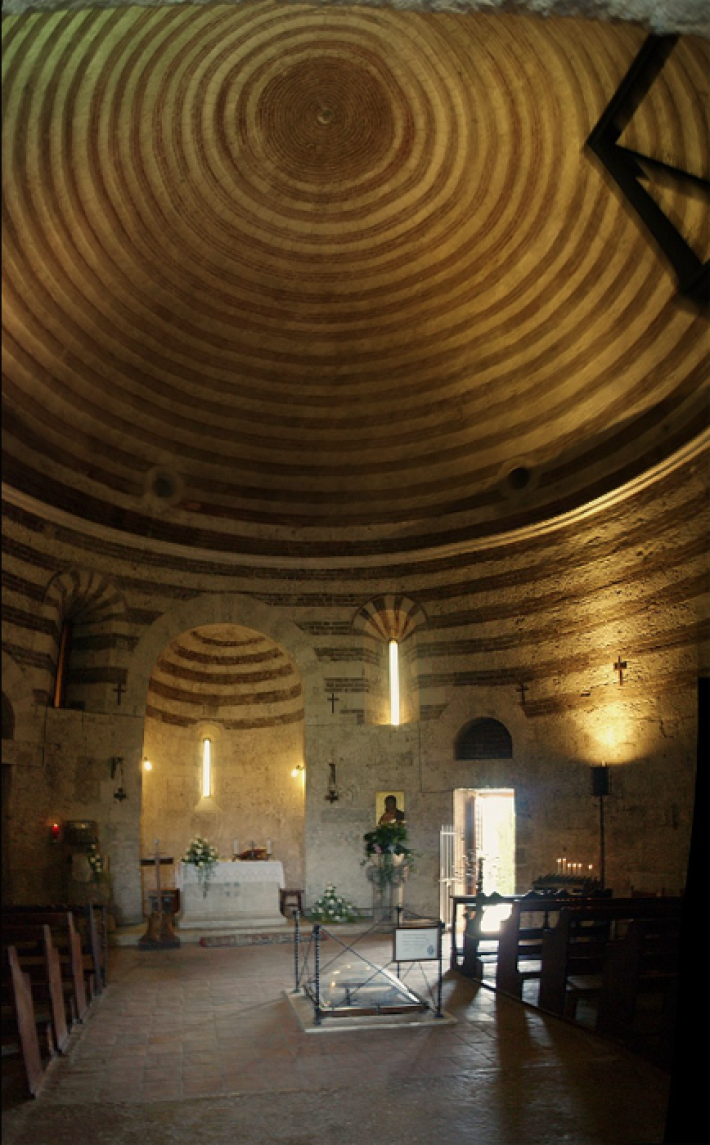 È con questo paradiso negli occhi che si arriva alla Rotonda di Montesiepi. È un edificio cilindrico caratterizzato da fasce alternate di pietra bianca e mattoni rossi, che salgono verso la cupola dove si trasformano in cerchi concentrici sempre più piccoli e più sottili fino all’apice, a tredici metri di altezza. È tutto bello, ma è bene non guardarli troppo quei cerchi optical, perché alla fine danno il capogiro e quasi ci si dimentica della spada piantata nel masso che emerge dal pavimento. È protetta da una cupoletta trasparente antiproiettile da quando, nel 1991, un tale che si sentiva re Artù la prese a martellate e la spezzò poco sotto l’elsa. L’invasato finì in manette, ma dopo un paio di settimane tornò a far danni, questa volta scheggiando anche la roccia.