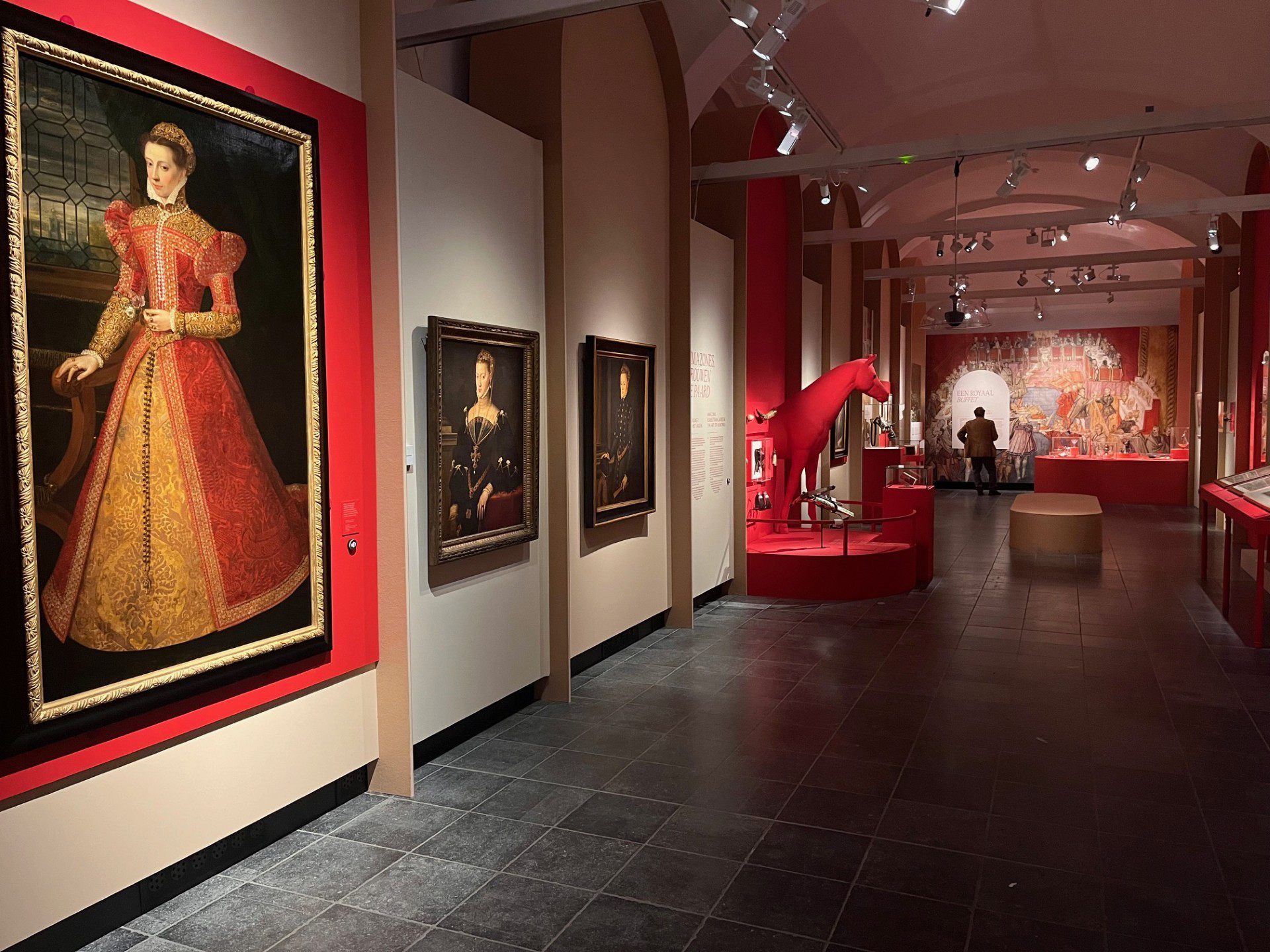 L'esposizione, che si tiene nello splendido municipio tardo gotico, racconta la vita di quella che non fu solo donna di intrighi ma anche un'appassionata mecenate, un'amante dell’arte. Ed infatti sono esposti disegni, arazzi, miniature, manufatti preziosi oltre a quadri che arrivano da mezzo mondo: da Buckingham Palace al Louvre, dal Rijksmuseum di Amsterdam al British Museum di Londra. E anche dalla Pinacoteca della Pilotta.