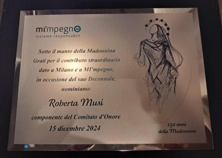 Nel corso di una serata al Museo della scienza e della tecnica di Milano, Roberta Musi è stata premiata dalla società MI’impegno per il suo contributo ai più bisognosi, realizzato con la vendita delle sue litografie natalizie.