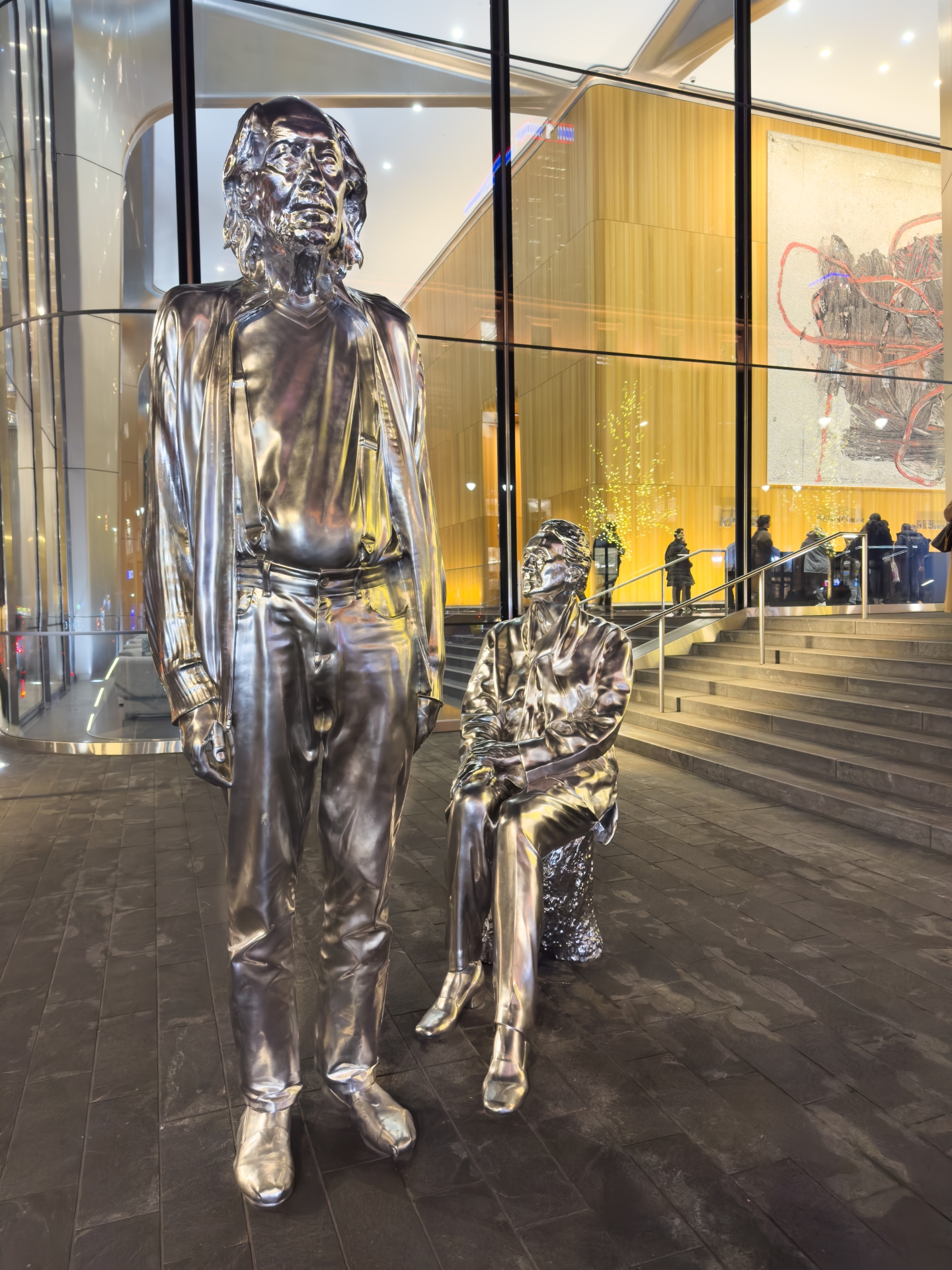 Non faccio in tempo a fare questo pensiero che, uscito dalla lobby del grattacielo, mi trovo di fronte a due splendidi alieni luccicanti, anche loro fuori scala. O meglio: fuori scala umana. Grandi come ti aspetteresti degli alieni evoluti, due metri e mezzo o tre, di potenza luminosa. Sembrano una coppia dopo aver appena finito di litigare. Lei è seduta a riflettere mentre guarda le persone camminare, l’altro scruta l’orizzonte in piedi, in direzione opposta, quasi cercasse dove ha parcheggiato l’astronave. “Ecco, sono venuti a prendermi”, penso. Poi mi metto gli occhiali e si intravedono meglio i lineamenti umani. Sono due persone anziane, con le rughe e tutto, ma ingigantiti e immortalati come due intrepidi Han Solo. Un altro capolavoro di Charles Ray, scultore “cecchino” che non sbaglia un colpo e ne tira pochi, come quel turco senza occhiali e mirino che faceva sempre centro alle Olimpiadi. La scultura si intitola Adamo ed Eva e l’artista ce li presenta invecchiati e normalizzati dalla quotidianità. Altri due newyorkesi persi nel frullatore, che aspettano la prossima onda o forse solo un taxi. Allontanandomi dall’edificio mi giro per un ultimo sguardo: l’acciaio delle sculture si confonde con quello del grattacielo. Vedo la coppia di alieni giganti con dietro l’immenso tappeto volante in prospettiva. Penso all’uomo sulla Luna che pianta la bandiera americana ma, a differenza di quella, il grande mosaico non sventola più.