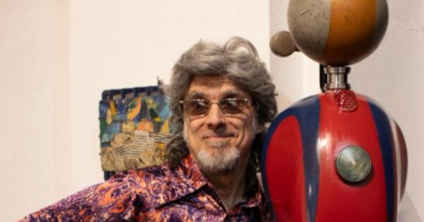 L'artista accanto a una sua opera