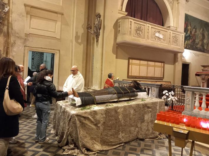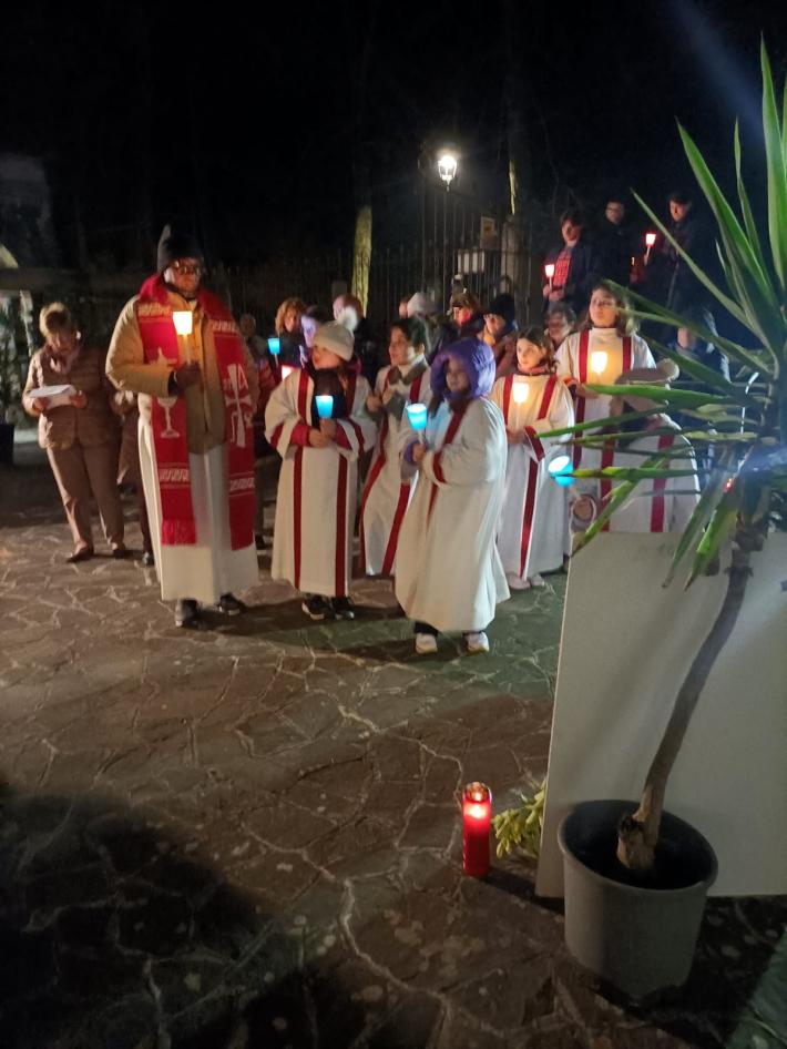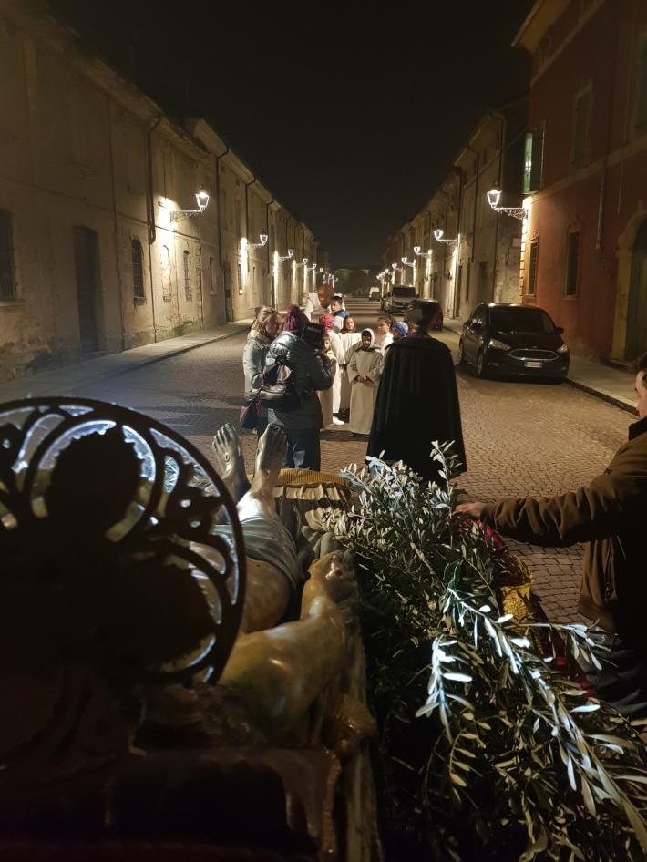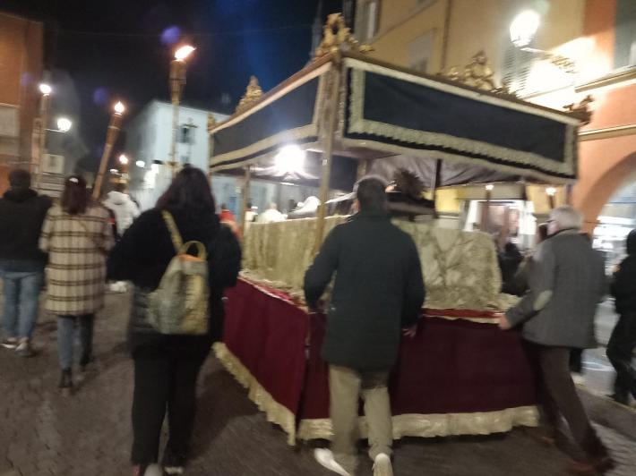 Rinnovato ieri sera, in occasione del venerdì Santo, in numerose località, l’antico e sentito rito della Via Crucis con la partecipazione, ovunque, di numerose persone. Nelle immagini i riti che si sono tenuti in diverse località della Bassa, da Busseto a Roncole Verdi per proseguire con Vidalenzo, Polesine, Zibello. A Busseto, in particolare, è stato portato in processione l’antico, venerato e misterioso simulacro custodito, da anni, nella chiesa di Santa Maria Annunziata. Simulacro che, si dice, sia giunto sulla sponda Parmense nel XV secolo, portato da una piena del Po. Il fiume impetuoso, stando sempre alle narrazioni che da tempo vengono tenute vive dalla memoria popolare, distrusse una chiesa cremonese (non è dato sapere quale), portandosi via, quindi, anche questa statua del Cristo Morto. La corsa sulle acque finì a Vidalenzo di Polesine (oggi Polesine Zibello), sulle rive del fiume naturalmente. Immediatamente la gente locale lo scambiò per un cadavere autentico. Una volta avvicinato ecco che la verità si materializzò: quello che era davanti a tutti era un simulacro, integro, del Salvatore rappresentato dopo la crocifissione. Subito divampò una diatriba, tra le opposte rive del Po, circa il luogo in cui il misterioso Cristo doveva essere portato. A dirimerla, stando sempre ai racconti che si tramandano, sarebbe stato un frate che consigliò di adagiare la statua su un carro trainato dai buoi. Dove questi si sarebbero fermati si sarebbe quindi dovuto costruire un luogo di culto. Se ciò fosse vero significherebbe, quindi, che i buoi, dopo aver compiuto una manciata di chilometri,si fermarono a Busseto, dove ora sorge la chiesa di Santa Maria Annunziata. Impressionanti sono anche i capelli e la barba del Cristo. Si tratta infatti di autentica capigliatura umana: quella che una donna donò, per grazia ricevuta, al Cristo stesso. La statua, alla quale i fedeli di Busseto sono estremamente legati e devoti, viene portata in processione, ogni anno, la sera del Venerdì Santo ed è anche al centro di un’altra storia ricca di fascino e mistero. Si dice infatti che, ormai molti anni fa, proprio dopo una processione del Venerdì Santo, fu lasciata in chiesa collegiata, la principale chiesa cittadina, senza essere riportata nella sua collocazione originaria. Il mattino seguente, l’incredibile sorpresa: il Cristo, infatti, non si trovava più in collegiata. Subito si pensò ad un furto e invece, poco dopo, fu ritrovato, di nuovo in Santa Maria Annunziata. Come ci arrivò se entrambe le chiese (collegiata e S.Maria) erano chiuse e non presentavano alcun segno di effrazione? In tanti, da allora, ritengono che, prodigiosamente si sia spostato, nel bel mezzo della notte, da una chiesa all’altra e che quindi voglia rimanere nell’edificio in cui da secoli è posto. Da evidenziare infine che, per la storica processione del Venerdì Santo, il maestro Giuseppe Verdi compose quattro Notturni: andati tutti persi. Dove si trovano? Sono andati persi per sempre o si trovano ancora celati in qualche angolo di Busseto e dintorni? Interrogativi che aumentano i misteri che accompagnano la storia di questo luogo.