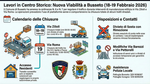 Importanti modifiche alla viabilità nel centro storico di Busseto sono in programma per mercoledì 18 e giovedì 19 febbraio. In via Zilioli, via Roma e le strade limitrofe saranno in corso lavori edilizi che comporteranno chiusure temporanee al traffico. Si tratta di interventi necessari per la manutenzione e il restauro di alcuni immobili storici, operazioni che richiedono l'utilizzo di piattaforme aeree e attrezzature specifiche che occuperanno temporaneamente la carreggiata.