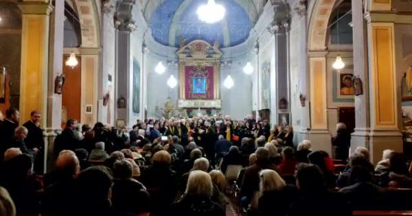 Emozionante esecuzione del brano Signore delle cime di Bepi de Marzi, eseguita nella chiesa di Marzolara sabato scorso da 100 coristi, durante la prima rassegna corale dedicata a Maurizio Broglia.