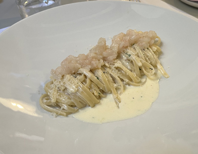 Linguine Artigianali condite con crema di limone e erbe aromatiche, con un battuto di gamberi crudi