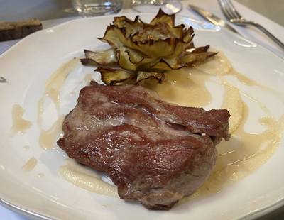 Pluma Di maiale rosso di Castiglia con tutto il succulento sapore della sua carne e un carciofo croccante