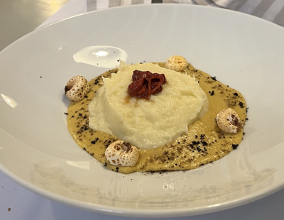 Baccalà Mantecato: una nuvola di leggerezza e sapore su crema di mais e polvere di capperi e olive