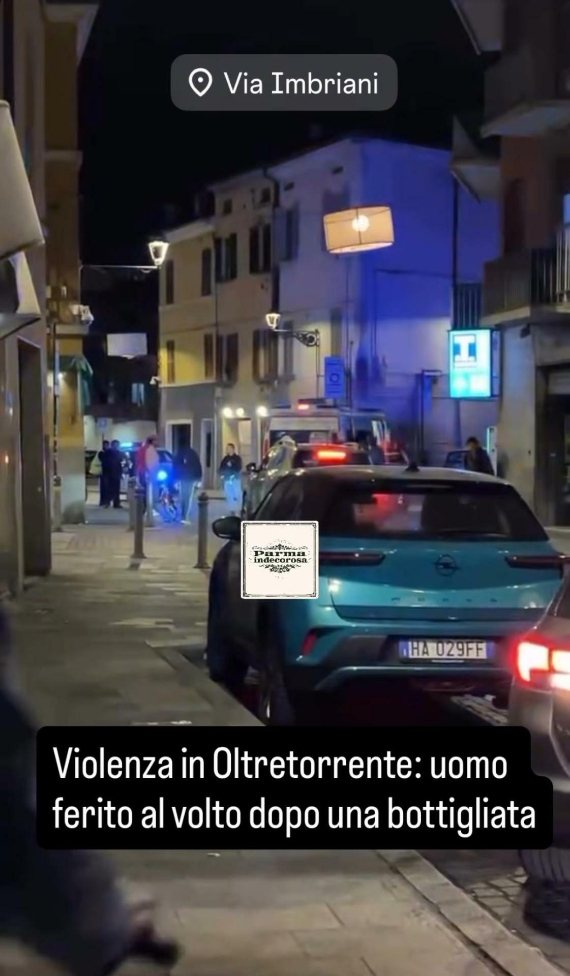 L'episodio è riferito (con foto, qui sotto) anche dalla pagina social di "Parma Indecorosa". Si tratterebbe di un'aggressione a bottigliate, sul posto la polizia.