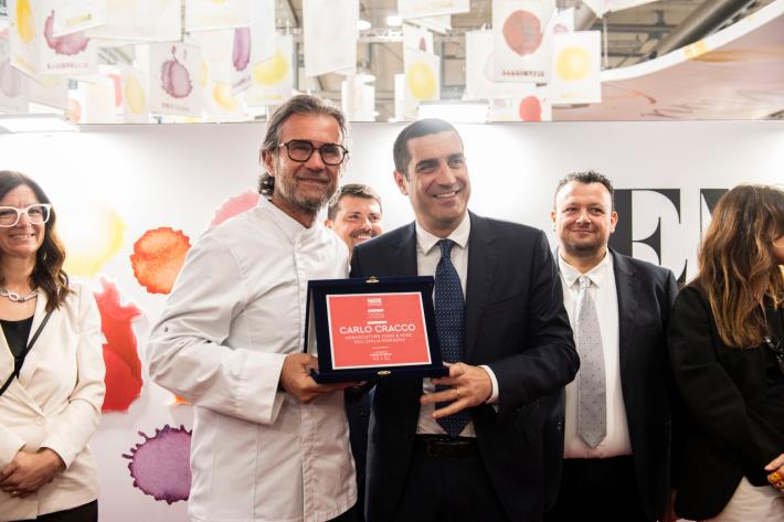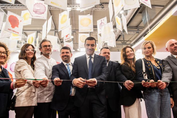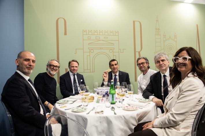A tagliare il nastro del padiglione Emilia-Romagna 2026, il presidente della Regione, Michele de Pascale, la sottosegretaria alla Presidenza, Manuela Rontini, l’assessore all’Agricoltura, Alessio Mammi, l’assessora al Turismo, Roberta Frisoni, gli chef stellati Carlo Cracco e Massimo Bottura, e la madrina, Simona Ventura. Presenti anche Davide Frascari, presidente dell'Enoteca Regionale Emilia-Romagna; Andrea Segrè, presidente di Casa Artusi; Maddalena Fossati, una delle promotrici della Cucina italiana patrimonio Unesco.
