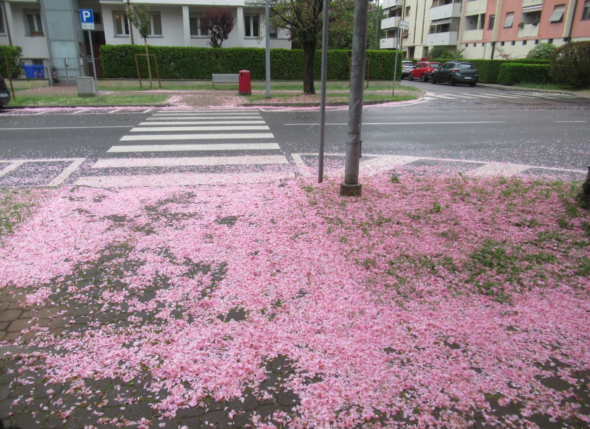 «Come tutti gli anni – scrive un residente della strada, che ha mandato queste foto – dura pochi giorni il paesaggio da fiaba in via Picasso, a cui la Gazzetta ha dedicato un servizio una decina di giorni fa. Ormai i petali stanno cadendo tutti e, dopo aver allietato la vista sopra agli alberi, adesso sui marciapiedi ci sono dei “tappeti” rosa. Tra qualche giorno, ormai, il rosa scomparirà del tutto».