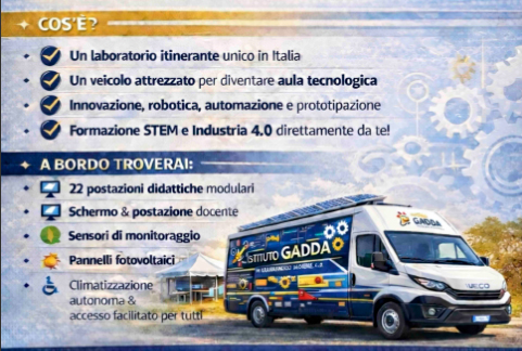 Si tratta di un progetto unico in Italia che consente di portare i laboratori direttamente nelle aziende e nelle scuole di ogni ordine e grado, favorendo attività di orientamento e didattica innovativa.