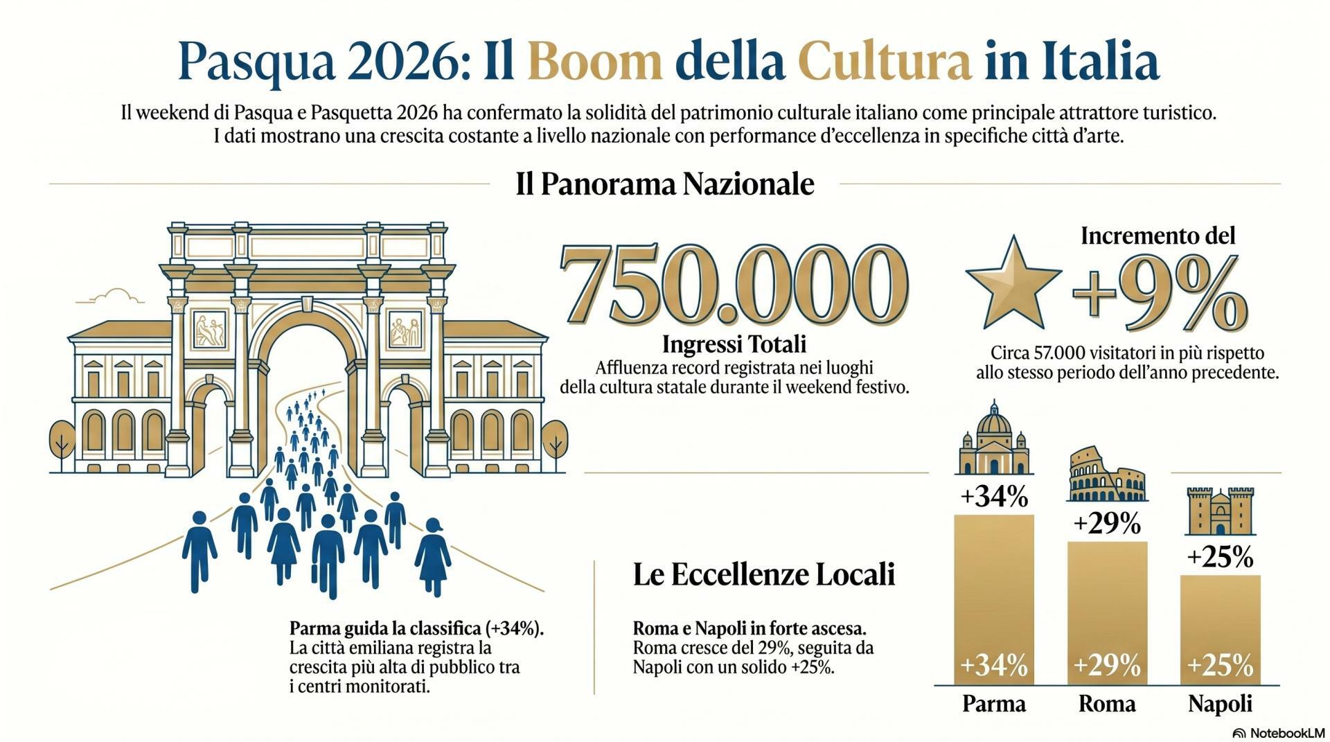 Un trend che si inserisce in un contesto nazionale solido: nel weekend di Pasqua e Pasquetta 2026 i luoghi della cultura statali hanno totalizzato circa 750 mila ingressi, con 57 mila visitatori in più rispetto allo stesso periodo dell’anno precedente, pari a un incremento complessivo intorno al 9%.