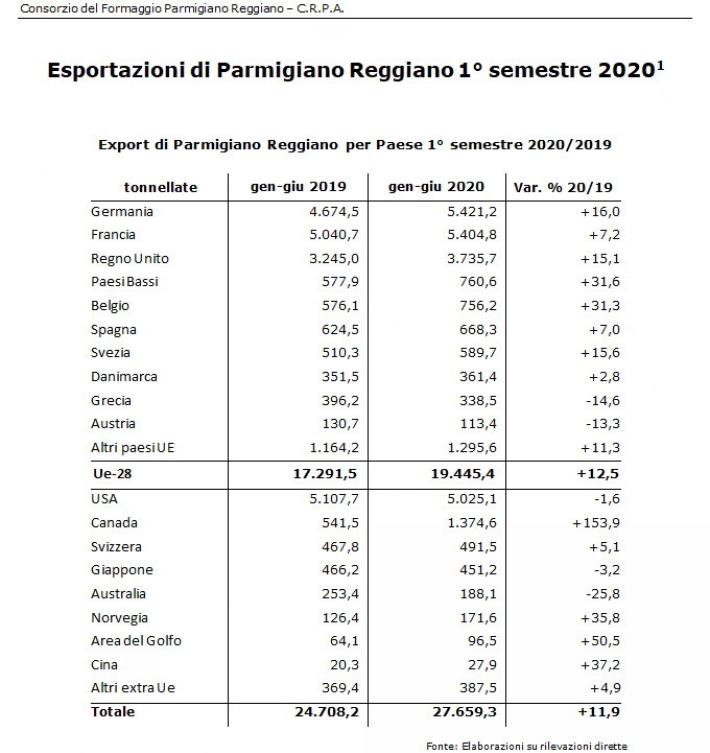 Nonostante il Covid e le incertezze sui mercati internazionali, il Parmigiano Reggiano chiude il primo semestre 2020 con il segno positivo sia in Italia che all’estero.