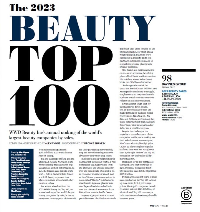 Il gruppo Davines, azienda attiva nel settore della cosmetica professionale con i marchi per l’haircare e per lo skincare, certificata B Corp dal 2016, è, per la prima volta, nella Beauty Inc Top 100 della rivista internazionale WWD, (Women's Wear Daily), rivista dell'industria della moda definita la "Bibbia della moda". La Beauty Inc Top 100, a cura della rivista internazionale WWD, riunisce ogni anno i leader del mercato cosmetico, le aziende manifatturiere internazionali classificate per fatturato. Nel 2023, anno del suo 40esimo anniversario, il fatturato del Gruppo Davines ha superato i 260 milioni di euro, registrando un altro anno di crescita a doppia cifra. Gli Stati Uniti sono anche nel 2023 il primo mercato, dove il Gruppo ha superato i 100 milioni di dollari fatturato, seguiti dall’Italia e
