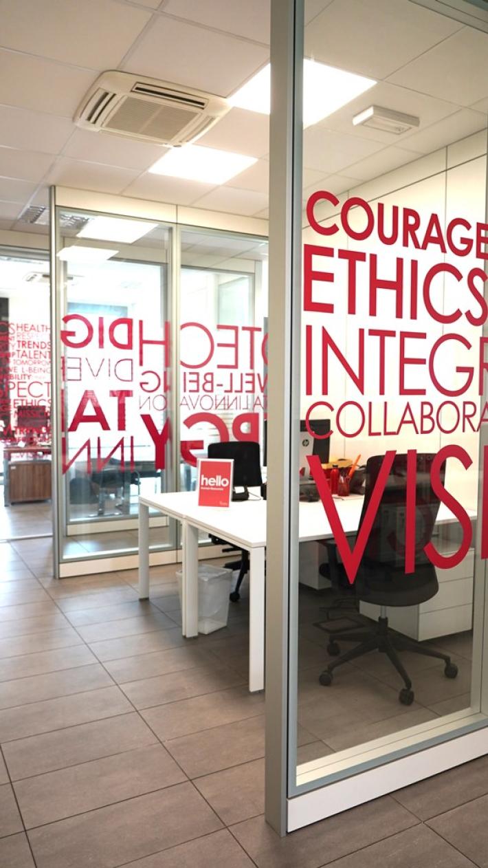 Etica, rispetto, innovazione, attenzione alle persone e future generazioni, talento per l'innovazione, integrità e coraggio. Sono le parole riprodotte a caratteri cubitali su molte delle luminose vetrate che caratterizzano la nuova veste di Puratos Italia, azienda del Gruppo Puratos, multinazionale belga che offre una gamma completa di ingredienti, soluzioni e servizi innovativi per l'industria della panificazione, pasticceria e cioccolato.
