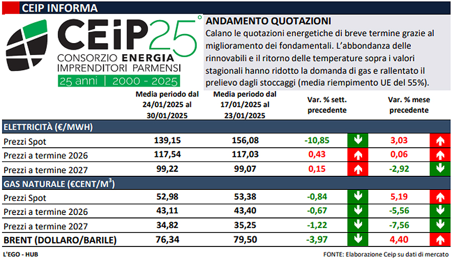 Le quotazioni dell'energia della settimana: nel grafico qui sotto, ecco i dati del Ceip (Consorzio energia imprenditori parmensi) con i prezzi di elettricità e gas.