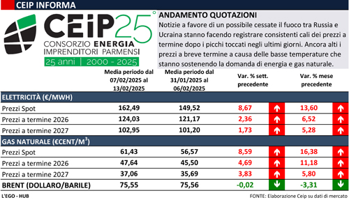 Le quotazioni dell'energia della settimana: nel grafico qui sotto, ecco i dati del Ceip (Consorzio energia imprenditori parmensi) con i prezzi di elettricità e gas.