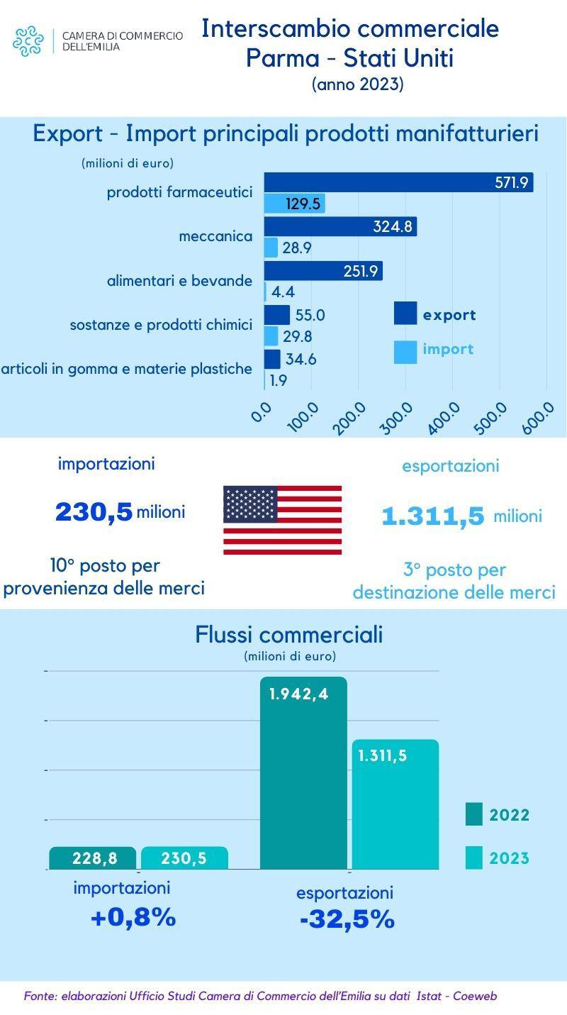 Continua ad aumentare la preoccupazione delle imprese parmensi in relazione all’evolversi delle politiche commerciali degli Stati Uniti, con la possibilità di nuovi dazi sulle importazioni europee – e in particolare sui prodotti agroalimentari, farmaceutici e meccanici – che andrebbero a colpire duramente l’export locale. Poco meno dell’90% delle vendite all’estero da parte delle imprese della nostra provincia, infatti, è legato proprio a questi comparti, all’interno dei quali si conferma la leadership del settore farmaceutico (con il 43,6% sul totale), seguito dalle macchine e apparecchiature industriali (la cui quota sul totale è del 24,8%) e dall’agroalimentare, che rappresenta il 19,2% delle esportazioni di prodotti made in Parma.
