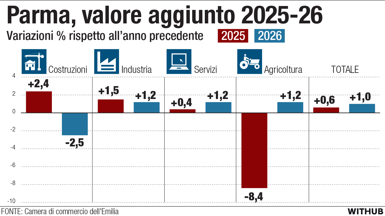 A differenza di quanto accade per altre province emiliane, anche le esportazioni parmensi, nonostante le tensioni internazionali e i dazi statunitensi, dovrebbero registrare un aumento (+4%); si prevede un calo dell’1,7% sul 2026.