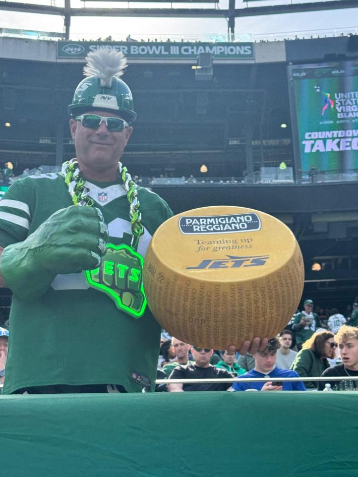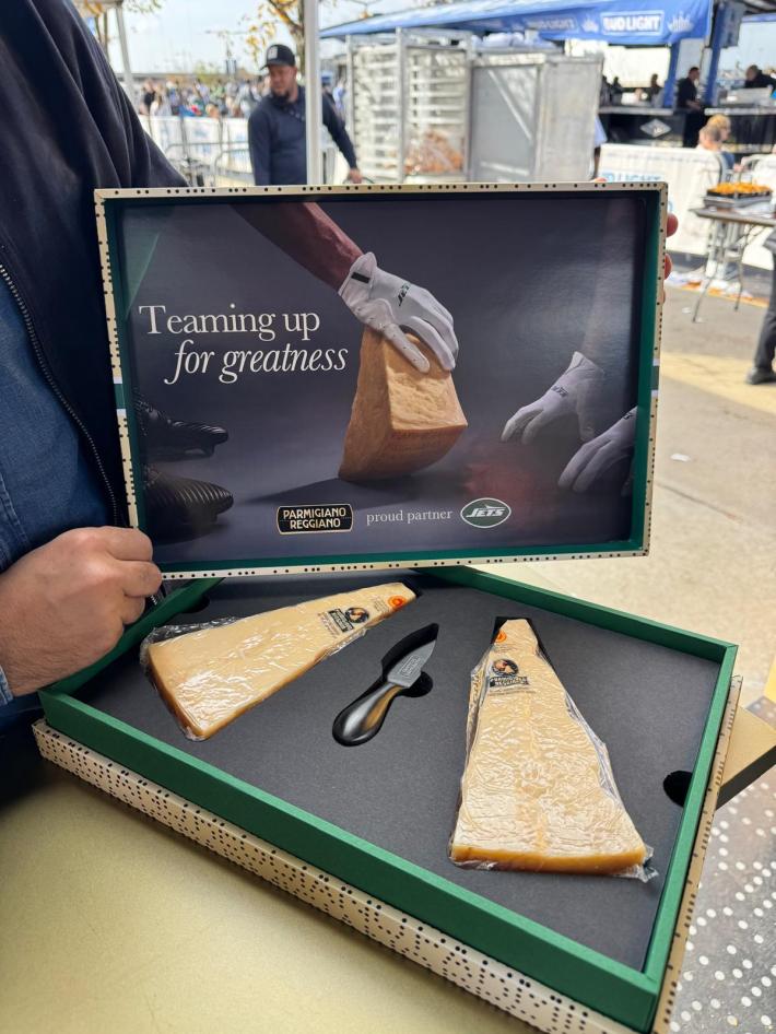 Un "parmigiano" a New York ci invia delle foto di Parmigiano. Una sorta di scioglilingua... Una cosa per volta: mondo Nfl, uno dei più sfavillanti nel pianeta sportivo. Un mondo in cui è entrato dalla porta principale anche il Parmigiano Reggiano, che sponsorizza una delle squadre più vecchie e, economicamente, ricche della Lega: i New York Jets. Ogni sfida dei verde-argento al MetLife stadium (struttura che i Jets condividono con i New York Giants) è presente non solo un "gustoso" stand del Parmigiano Reggiano, ma anche all'interno come cornice alle partite girano gadgets e "forme" a "colorare" e impreziosire il match.