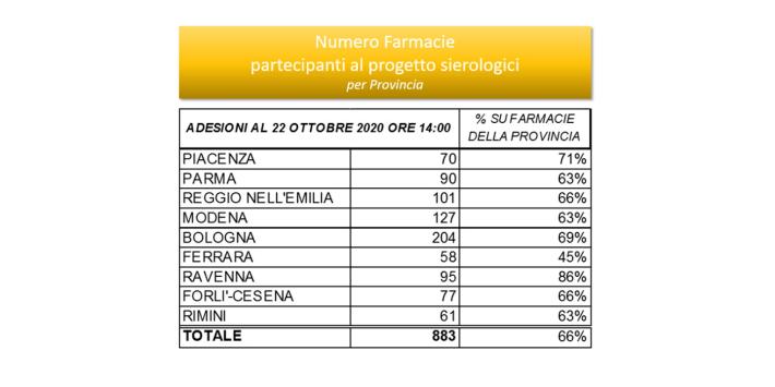A Bologna sono 204 le farmacie che hanno aderito, oltre la metà di quelle presenti; a Modena 127 (63% del totale); Reggio Emilia 101 (66%); Ravenna 95 (86%); Parma 90 (63%); Forlì-Cesena 77 (66%); Piacenza 70 (71%); Rimini 61 (63%) e Ferrara 58 farmacie (45% del totale).