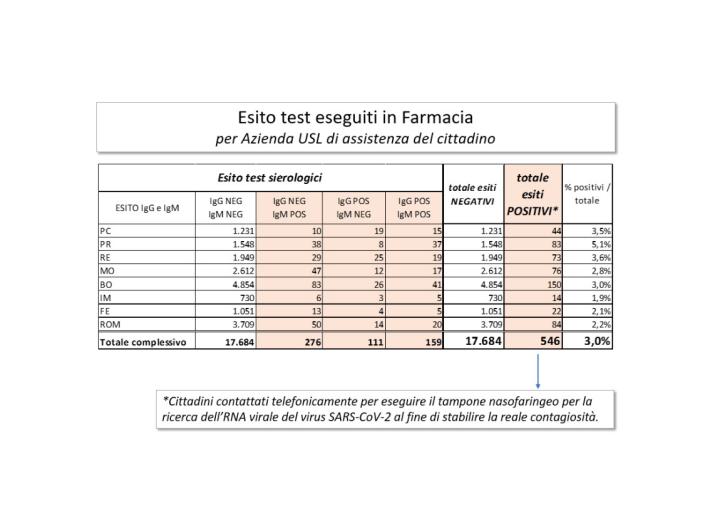 Sono oltre 18mila (esattamente 18.231) i test sierologici rapidi e gratuiti effettuati nelle farmacie dell’Emilia-Romagna nei primi tre giorni (da lunedì 19 a mercoledì 21) di avvio della campagna di screening, la prima a livello nazionale, voluta dalla Regione e condotta assieme alle Associazioni di categoria delle farmacie convenzionale. Nel 97% dei casi (in numero assoluto 18.231) hanno dato esito negativo,