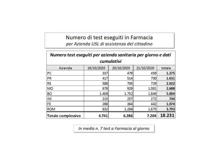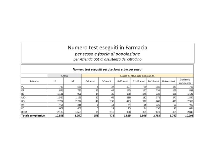 In dettaglio, i test effettuati nell’ambito delle singole Aziende sanitarie del territorio emiliano-romagnolo sono: Azienda USL di Bologna 5.004; Azienda USL della Romagna 3.793; Azienda Usl di Modena 2.688; Azienda Usl di Reggio Emilia 2.022; Azienda Usl di Parma 1.631; Azienda Usl di Piacenza 1.275; Azienda Usl di Ferrara 1.074 e Azienda Usl di Imola 744.