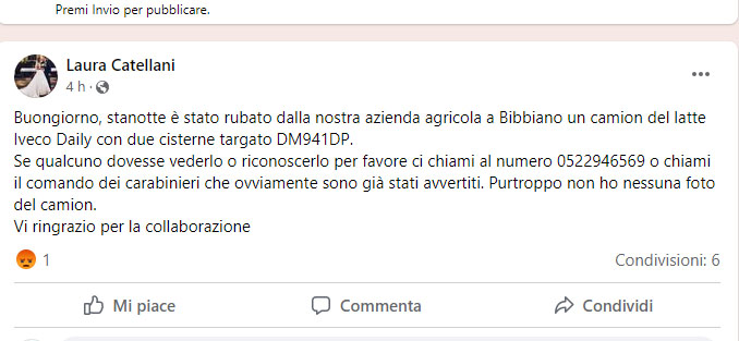 I "soliti ignoti" hanno colpito nottetempo in una stalla di Barco (frazione di Bibbiano) che appartiene all'azienda agricola Catellani di Cavriago. E' stato rubato un camioncino bianco (tipo Daily) con due cisterne per il latte. Sui social network è stato pubblicato l'appello a chiunque dovesse vedere in giro un mezzo del genere; la targa è DM 941 DP.