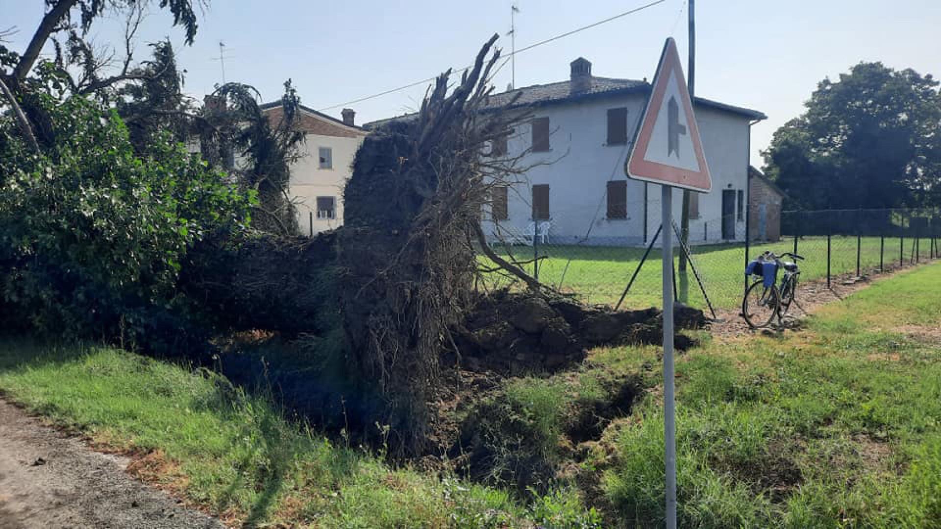 E poi Alfonsine, Bagnacavallo, Fusignano sono altri luoghi dove il maltempo ha imperversato, con crolli, alberi caduti, tralicci accartocciati e chicchi di grandine come palline da tennis a devastare frutteti e vigneti, filari letteralmente piegati.
