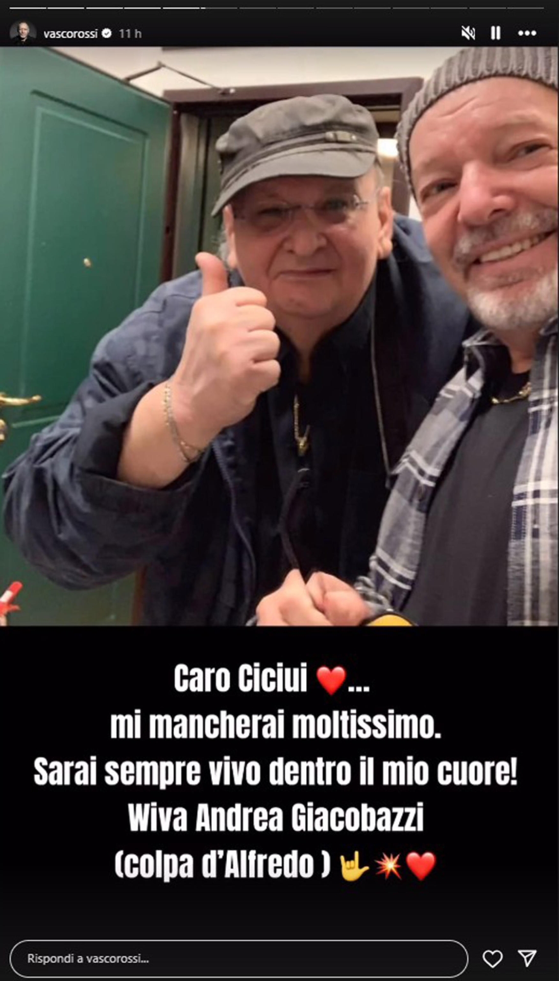 Discorsi di un amico insomma, che, questa volta fuor di retorica, Vasco Rossi appresa la notizia ha voluto ricordare e celebrare di fronte all’altrettanto nutrito pubblico della rete: «Ciao Ciciui... mi mancherai moltissimo. Sarai sempre vivo dentro il mio cuore. Wiva Andrea Giacobazzi (colpa d’Alfredo). Lui è stato tra i primi - prosegue il messaggio del Blasco - ad avere la "visione" di quello che poi è diventato 'Modena Park'». E il concerto dei record non poteva che partire proprio da lui, da Andrea alias Alfredo.