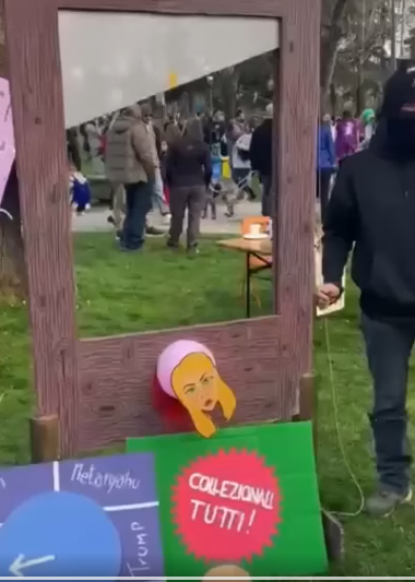 Una finta ghigliottina di cartone sotto alla quale sono finite le sagome raffiguranti le teste della premier Giorgia Meloni e quelle di leader politici mondiali, da Donald Trump a Benjamin Netanyahu passando per Victor Orban e Vladimir Putin e pure per Elon Musk. Il tutto con a fianco una sorta di «ruota della fortuna» per estrarre chi decapitare e la scritta: «Collezionali tutti».