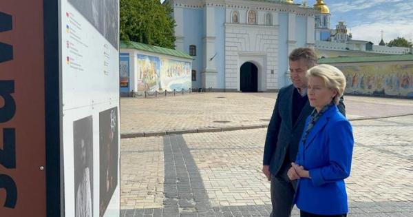 Il capo dell'esecutivo europeo ha poi visitato il muro della memoria dei caduti per l'Ucraina di fronte al monastero di San Michele a Kiev. Dopo essersi fermata di fronte al muro si è poi spostata nella piazza dove le sono stati mostrati i resti dei carri armati e mezzi russi esposti sul posto.