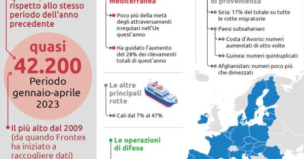 Bruxelles - Gli ingressi illegali sulla rotta del Mediterraneo centrale sono aumentati a quasi 42.200 nel periodo gennaio-aprile 2023: si tratta di un dato quadruplicato rispetto allo stesso periodo dell'anno precedente, raggiungendo il livello più alto da quando Frontex ha iniziato a raccogliere dati nel 2009. A riportare le cifre aggiornate è la stessa agenzia per il controllo delle frontiere esterne Ue in una nota. La rotta rappresenta così "poco più della metà degli attraversamenti irregolari nell'Ue fino a quest'anno", ovvero "circa 80.700, quasi il 30% in più rispetto a un anno fa e il totale più alto per il periodo gennaio-aprile dal 2016".