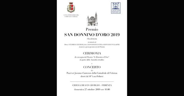 Domenica 27 ottobre 2019 alle ore 16.00 nella Chiesa di San Giorgio a Fidenza si terrà la 33ma edizione del Premio "San Donnino d'Oro", consegnato ogni anno a singoli o a gruppi di bambini e ragazzi, in età scolare fino a 18 anni, residenti o attivi nella Diocesi di Fidenza, che si siano distinti con iniziative e/o azioni di solidarietà e di altruismo.