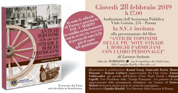 Giovedi 28 febbraio alle 17, allAuditorium dell'Assistenza Pubblica, sarà presentato il libro "Antichi toponimi delle più note strade e borghi parmigiani con i loro personaggi", di Lorenzo Sartorio. Appuntamento in via Gorizia, 2/A a cura di Lions Club di Parma e Provincia.