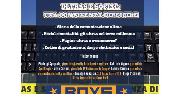 L'appuntamento è per sabato 12 gennaio alle 16.30, alla Fondazione Matteo Bagnaresi (via Saragat, 33). I Boys Parma invitano tifosi ed interessati al convegno su «Ultras e social: una convivenza difficile». Si parlerà di storia della comunicazione ultras, di scial e mentalità, gli ultras nel terzo millennio, di pagine ultras e e-commerce, di codice di gradimento, daspo elettronico e social. Interverrano i giornalisti Pierluigi Spagnolo, Gabriele Viganò, Milva Cerveni, Daniele Caroleo, lo SLO del Parma Giuseppe Squarcia e Diego Piccinelli (Ultras Brescia 1911).