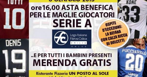 Martedì 6 gennaio, la Lega Italiana Fibrosi Cistica Emilia organizza un’Asta Benefica allo scopo di raccogliere fondi per il sostegno e la cura di chi è affetto da questa patologia. In palio le maglie originali del calcio di Serie A. L’evento avrà luogo, a partire dalle ore 16,00, presso il ristorante pizzeria UN POSTO AL SOLE, in v.le Vittoria, 43, a Parma, locale da sempre vicino all’Associazione. Diverse le squadre che hanno donato le maglie dei loro titolari. Un vero battitore d’asta animerà l’evento e, nel divertimento di adulti e bambini, chi la spunterà si porterà a casa la maglia originale del grande atleta. Ai bambini presenti il ristorante Un Posto Al Sole offrirà una golosa merenda a buffet mentre una befana si aggirerà tra le sale per distribuire caramelle e dolcetti. Anche in questa occasione la LIFC Emilia, organizzazione di volontariato che favorisce solidarietà concreta verso le persone affette da fibrosi cistica e che collabora in stretto contatto con il Centro di cura regionale presente a Parma, promuove con energia e speranza la sua mission: “Qualità della vita, qualità delle cure per i malati FC”. La Fibrosi cistica è una grave patologia cronica, ancora oggi senza possibilità di guarigione. In Italia si contano 200 nuovi casi all'anno. La ricerca è fondamentale per la cura oltre che per la speranza di trovare una strada verso la guarigione. www.fibrosicisticaemilia.it